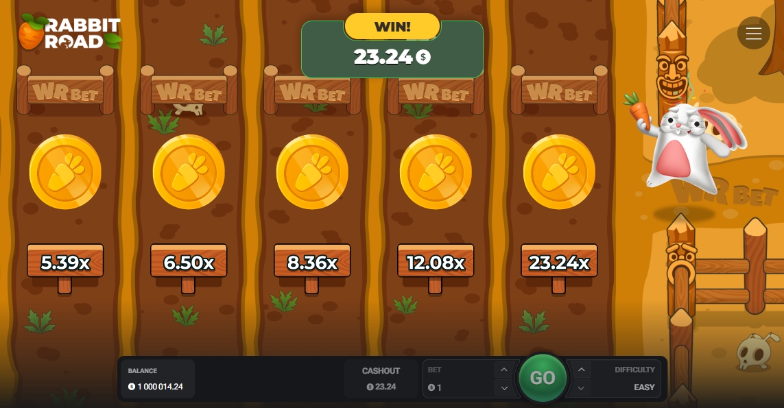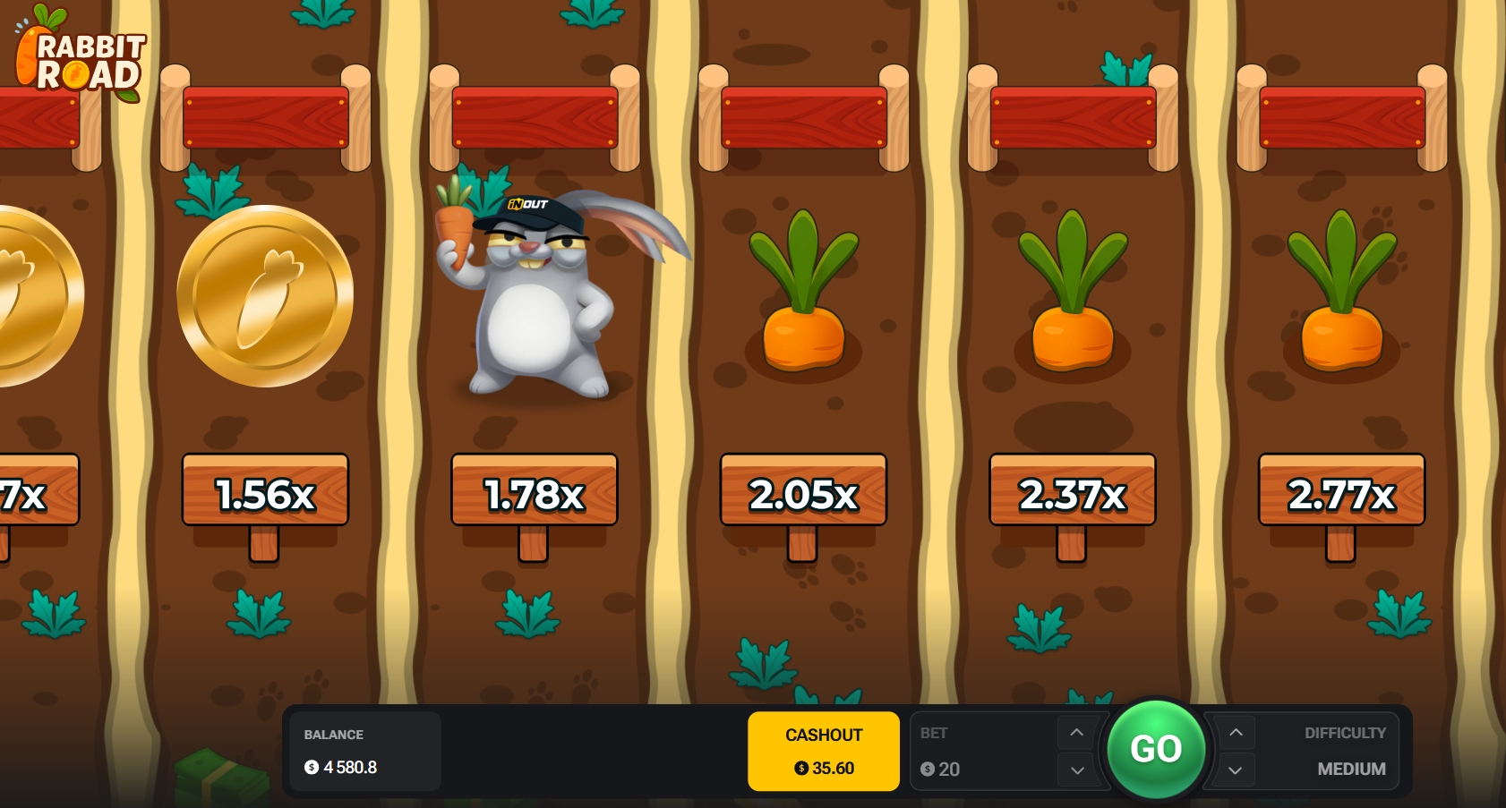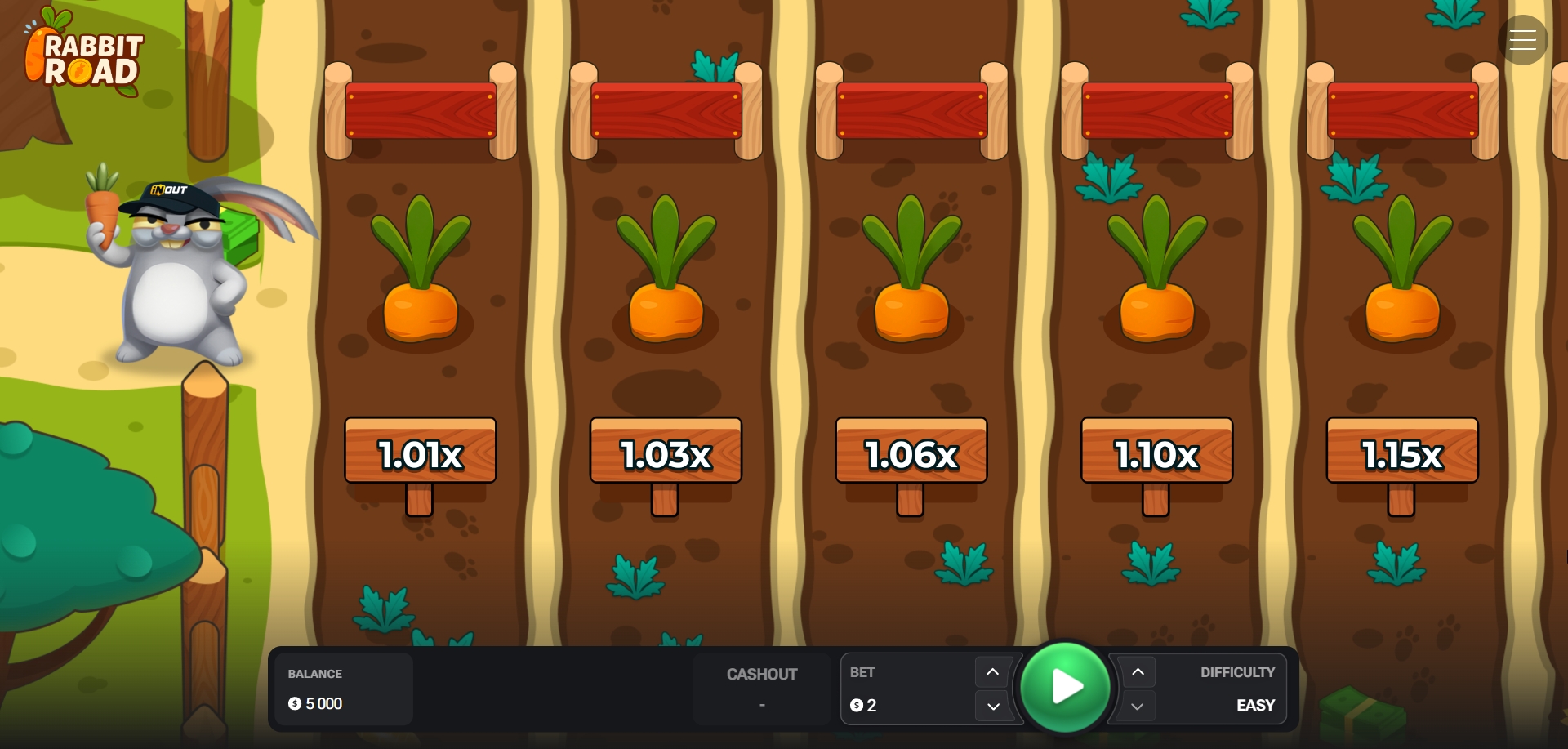 W Rabbit Road najpierw stawiasz zakład. Następnie wybierasz poziom trudności (od łatwego do trudnego), który określa liczbę skoków do wykonania i prawdopodobieństwo przejechania. Przejdź królikiem przez ogród, nie dając się złapać wystającym z ziemi łapom. Każdy skok mnoży stawkę. Możesz wycofać się w dowolnym momencie lub zdecydować się przejść całą drogę i przeprowadzić królika na drugą stronę.